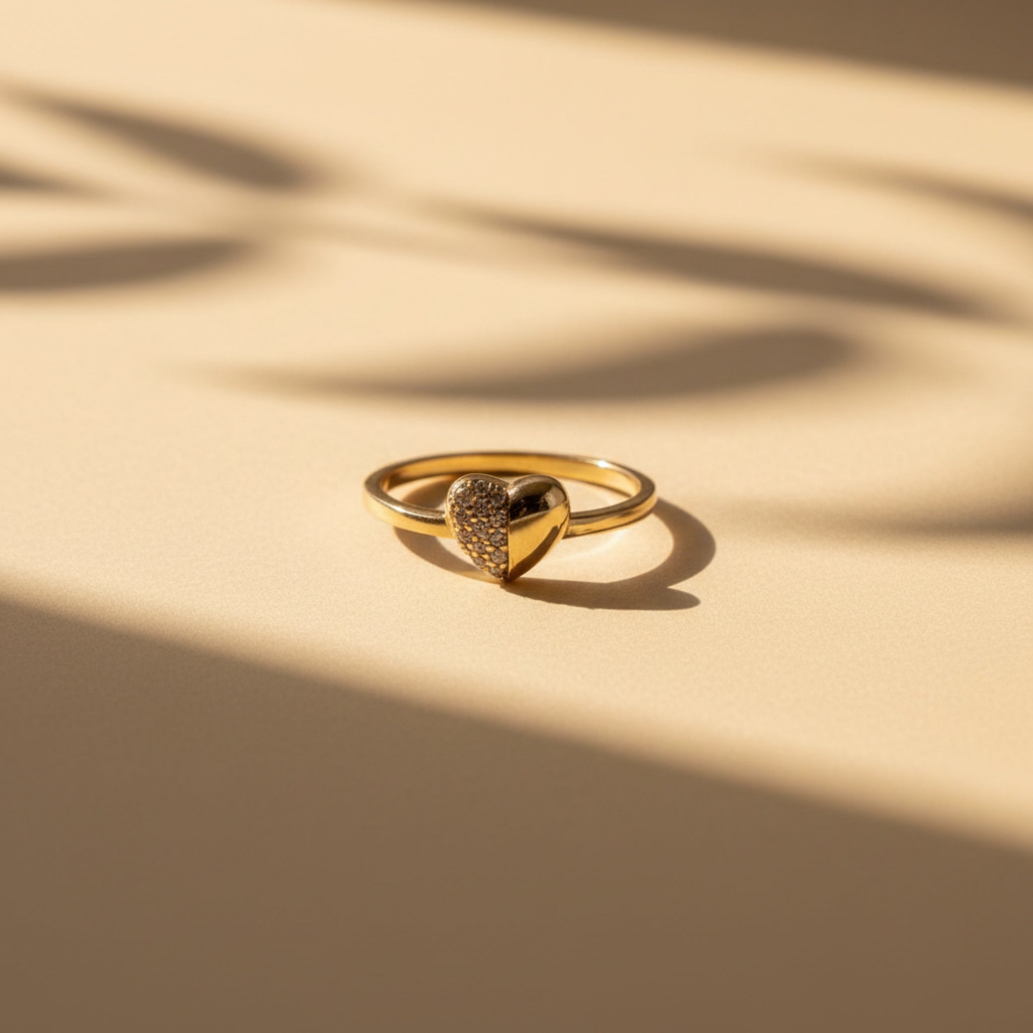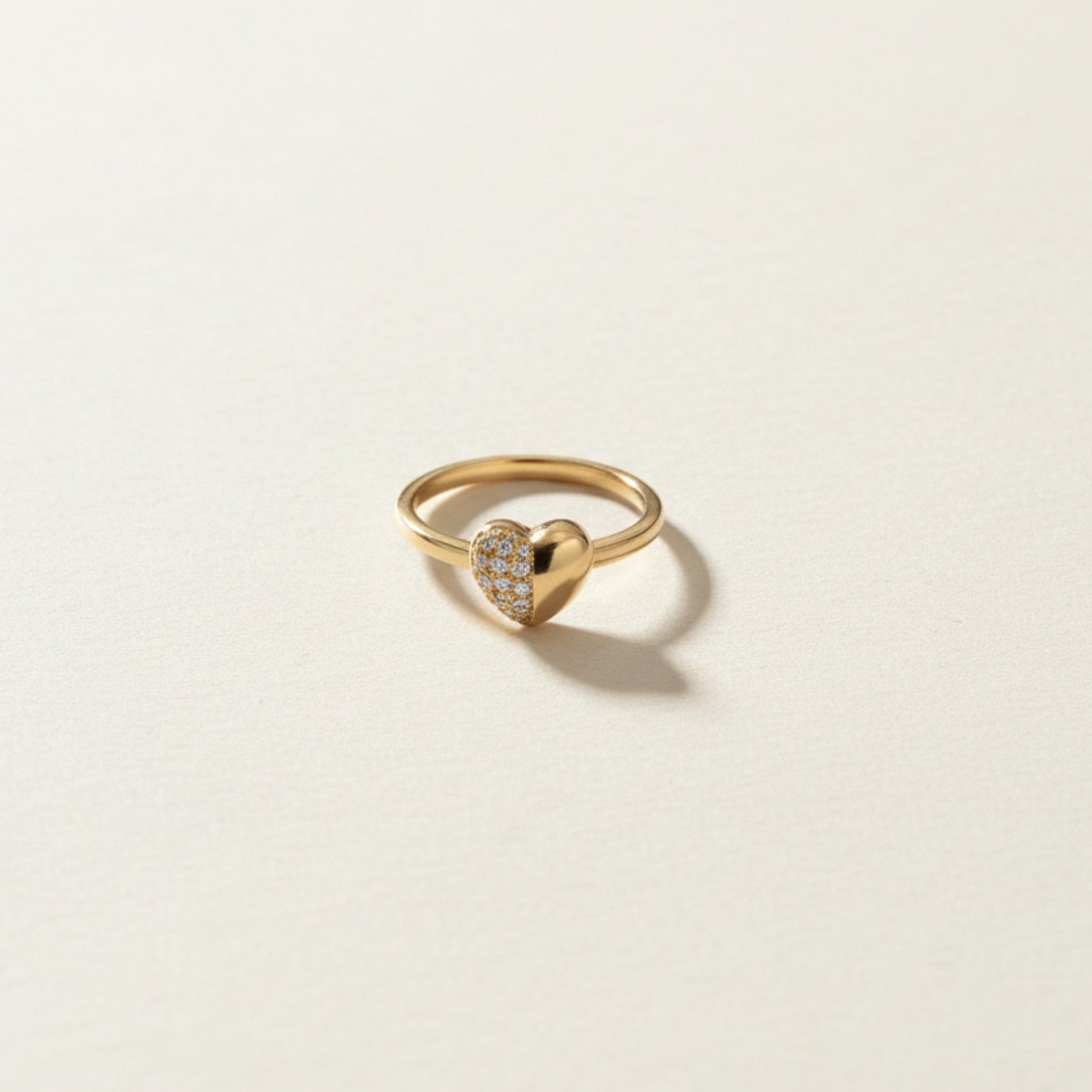 A refined 14K gold ring featuring a subtle heart motif with an extra-polished shine.